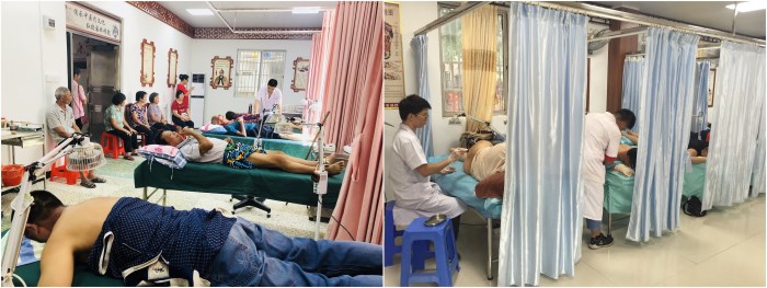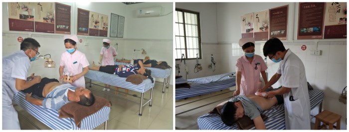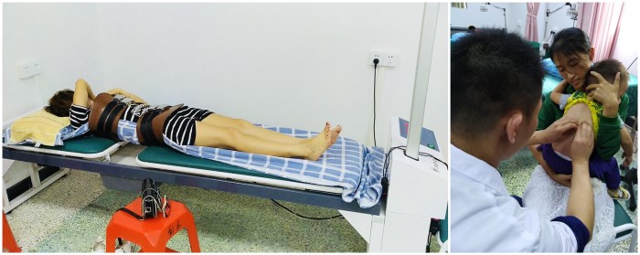 那吉鎮(zhèn)衛(wèi)生院開展腰椎牽引治療(左)和小兒捏脊治療
