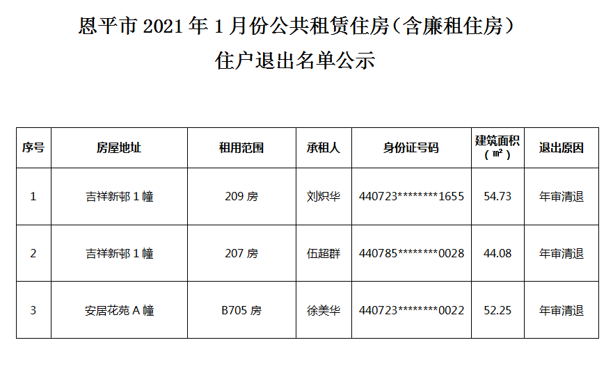 恩平市2021年1月份公共租賃住房(含廉租住房)住戶退出名單公示