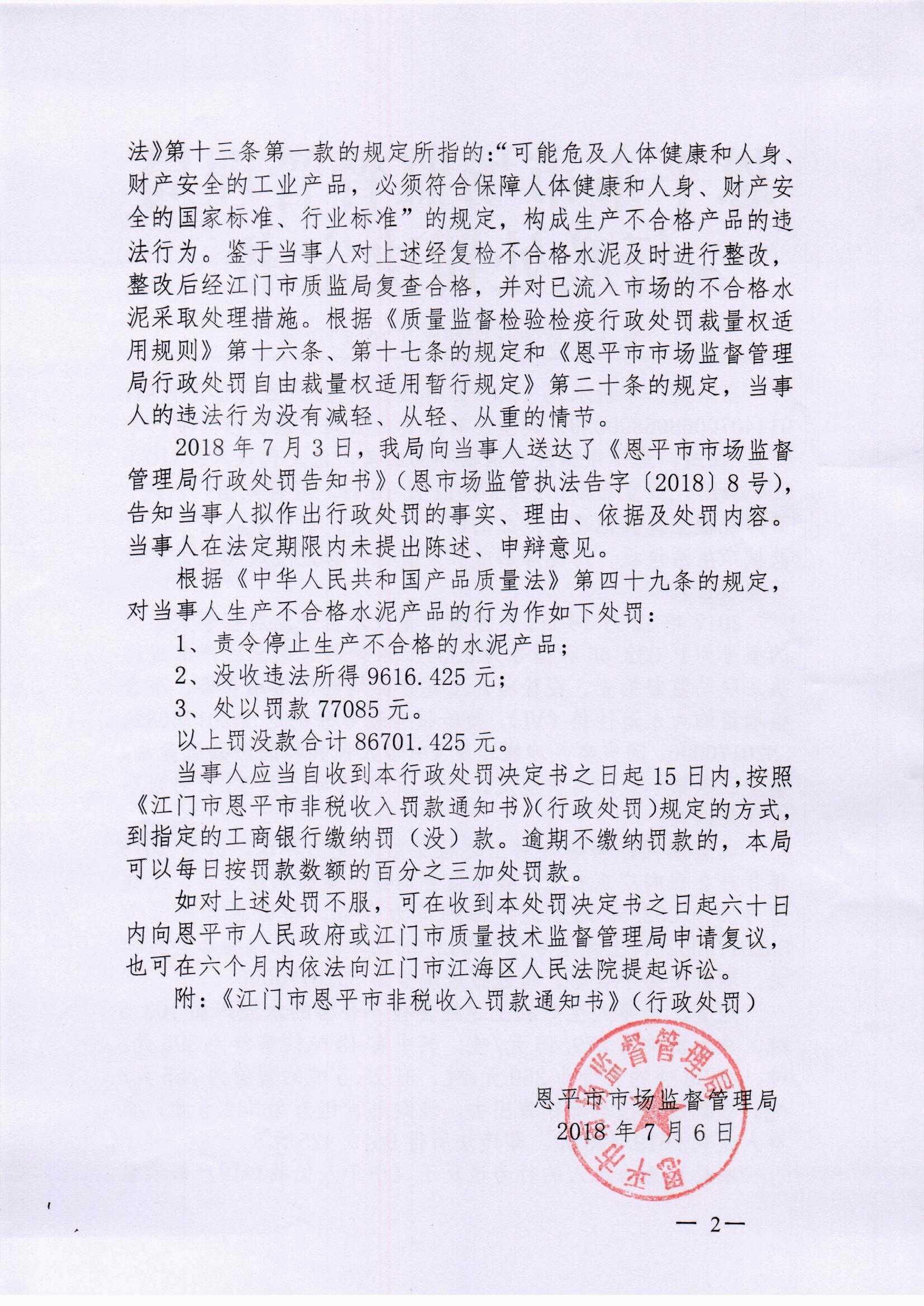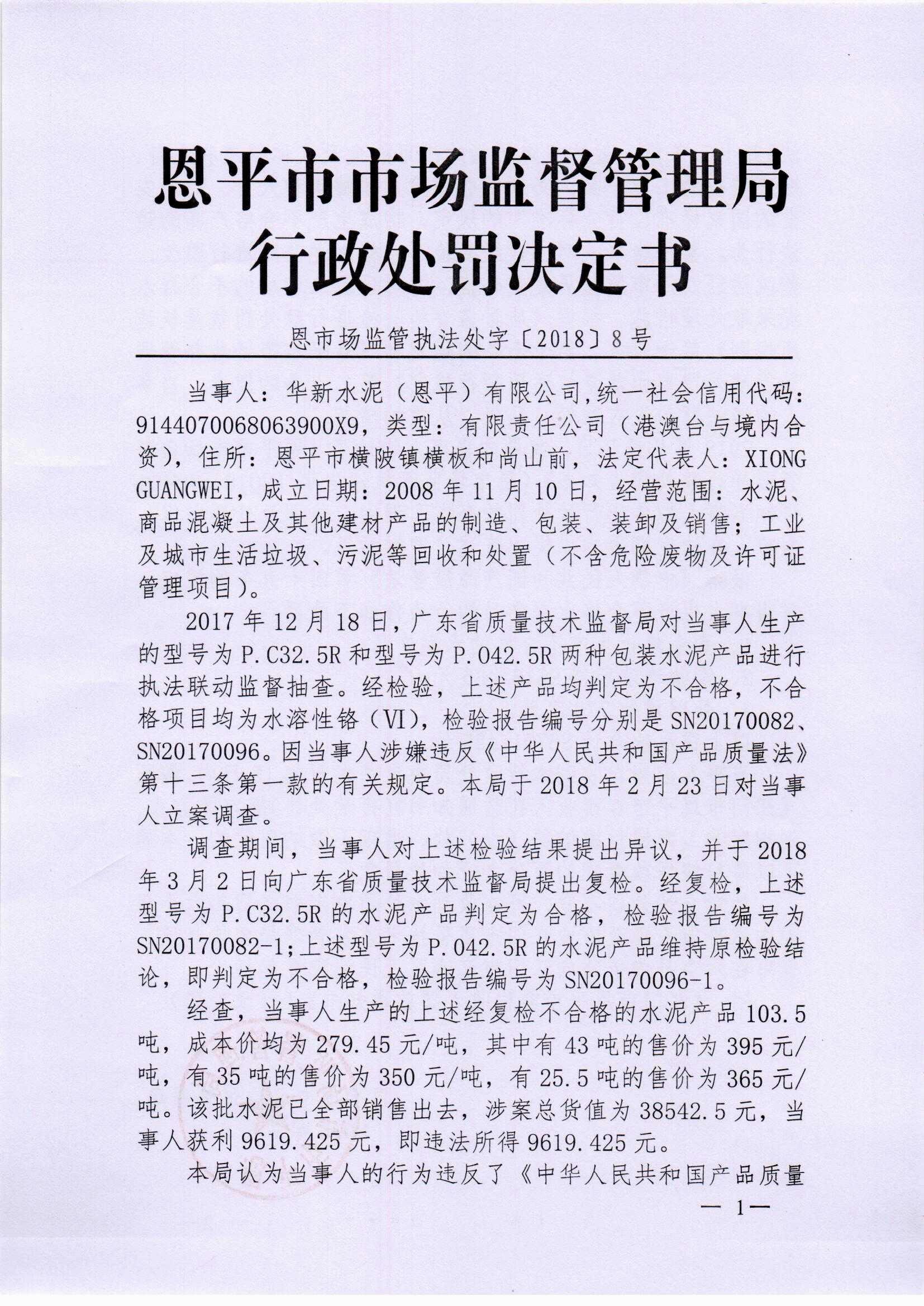 華新水泥(恩平)有限公司生產(chǎn)不合格產(chǎn)品案