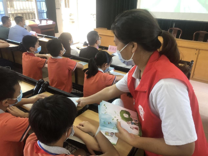 普法志愿者向?qū)W生派發(fā)宣傳資料