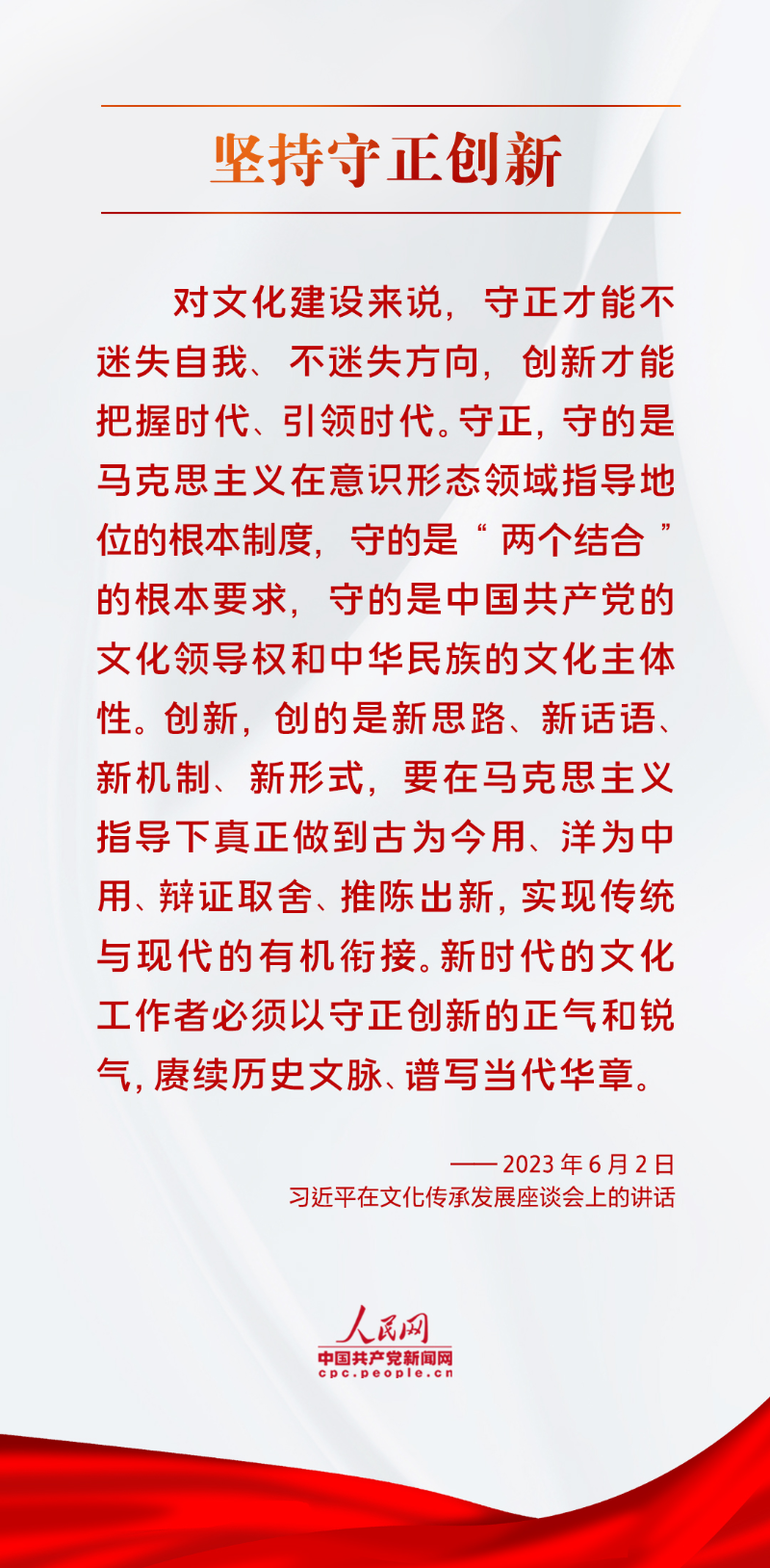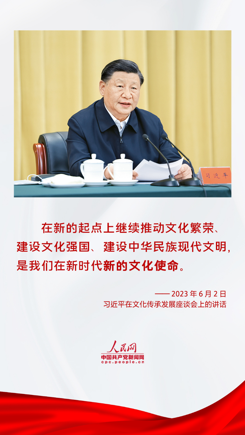 2023年6月2日,習(xí)近平總書記在文化傳承發(fā)展座談會(huì)上發(fā)表重要講話,進(jìn)一步深刻闡明我們在新時(shí)代新的文化使命,對努力建設(shè)中華民族現(xiàn)代文明提出明確要求,對于更好擔(dān)負(fù)起新的文化使命,全面落實(shí)黨的二十大關(guān)于宣傳思想文化工作的各項(xiàng)戰(zhàn)略部署,扎實(shí)推進(jìn)中華民族現(xiàn)代文明和社會(huì)主義文化強(qiáng)國建設(shè),具有重大指導(dǎo)意義。