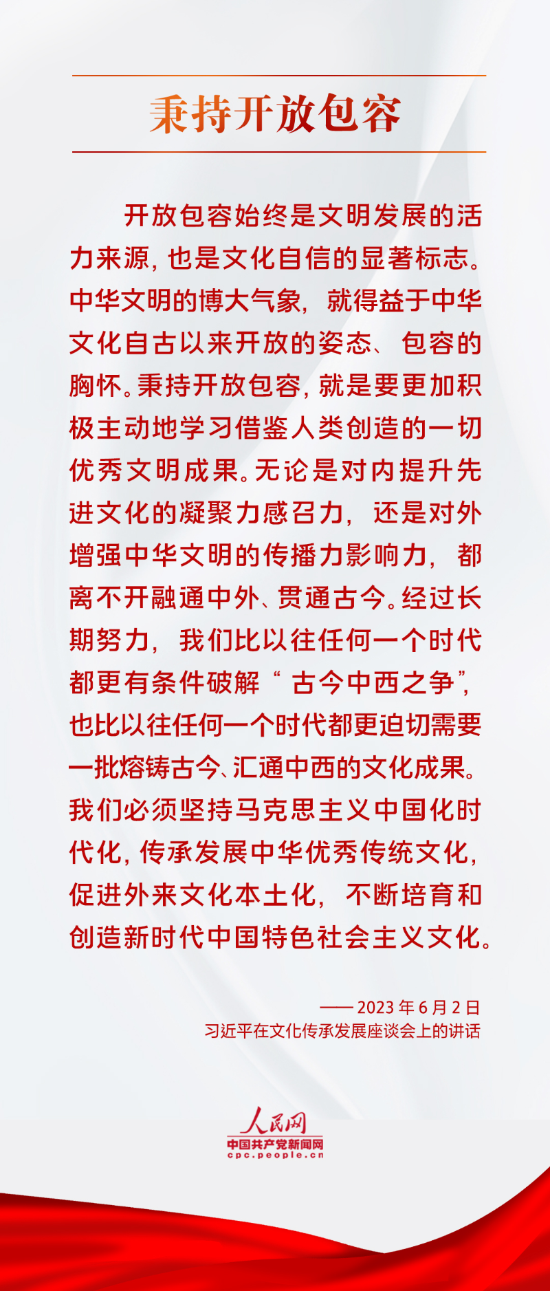 圍繞在新的歷史起點(diǎn)上繼續(xù)推動(dòng)文化繁榮、建設(shè)文化強(qiáng)國、建設(shè)中華民族現(xiàn)代文明這一新的文化使命,習(xí)近平總書記強(qiáng)調(diào)要“堅(jiān)定文化自信”“秉持開放包容”“堅(jiān)持守正創(chuàng)新”。