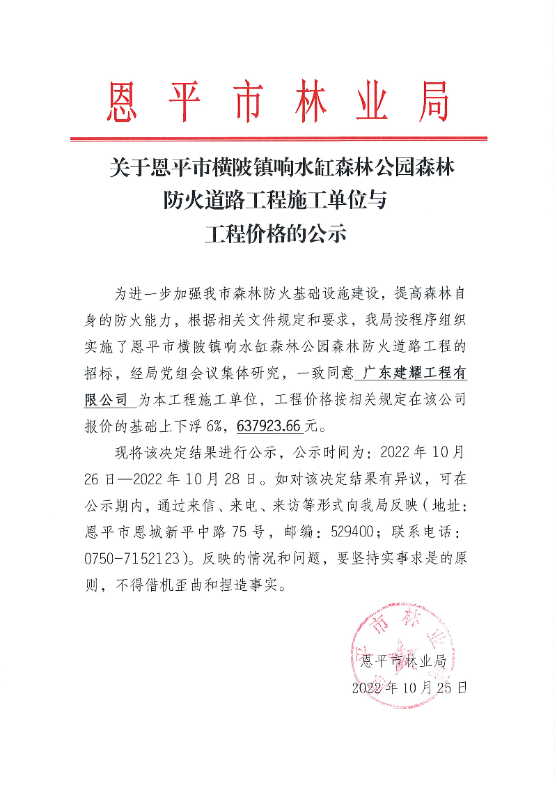 關(guān)于恩平市橫陂鎮(zhèn)響水缸森林公園森林防火道路工程施工單位與工程價(jià)格的公示