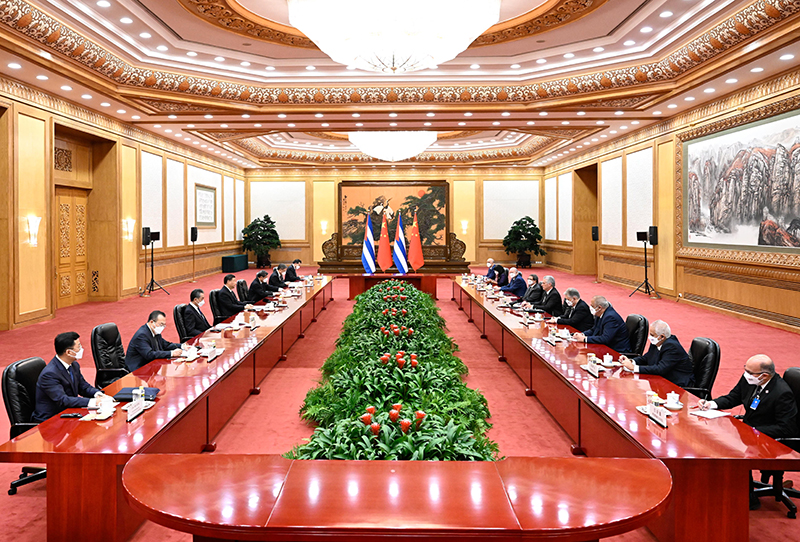 習(xí)近平指出,你是中共二十大后首位訪華的拉美和加勒比國(guó)家元首,充分體現(xiàn)了中古兩黨兩國(guó)的特殊友好關(guān)系。古巴是西半球第一個(gè)同新中國(guó)建立外交關(guān)系的國(guó)家,中古關(guān)系成為社會(huì)主義國(guó)家團(tuán)結(jié)合作、發(fā)展中國(guó)家真誠(chéng)互助的典范。中方愿同古方不斷深化政治互信,拓展務(wù)實(shí)合作,在涉及彼此核心利益問題上堅(jiān)定相互支持,在國(guó)際和地區(qū)事務(wù)中加強(qiáng)協(xié)調(diào)配合,在建設(shè)本國(guó)特色社會(huì)主義道路上攜手并進(jìn),不斷深化新時(shí)代中古關(guān)系。