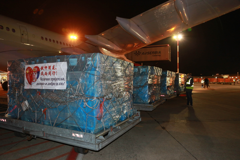 在塞爾維亞首都貝爾格萊德,寫有 “鐵桿朋友,風雨同行”字樣的中方捐贈醫(yī)療物資從飛機上卸下(2020年3月21日攝)。新華社記者 石中玉 攝