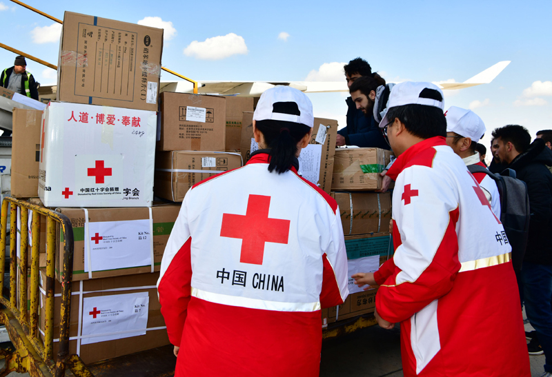 工作人員在敘利亞大馬士革國際機場卸載中國紅十字會援助的人道主義物資(2023年2月13日攝)。新華社發(fā)(阿馬爾·薩法爾賈拉尼 攝)