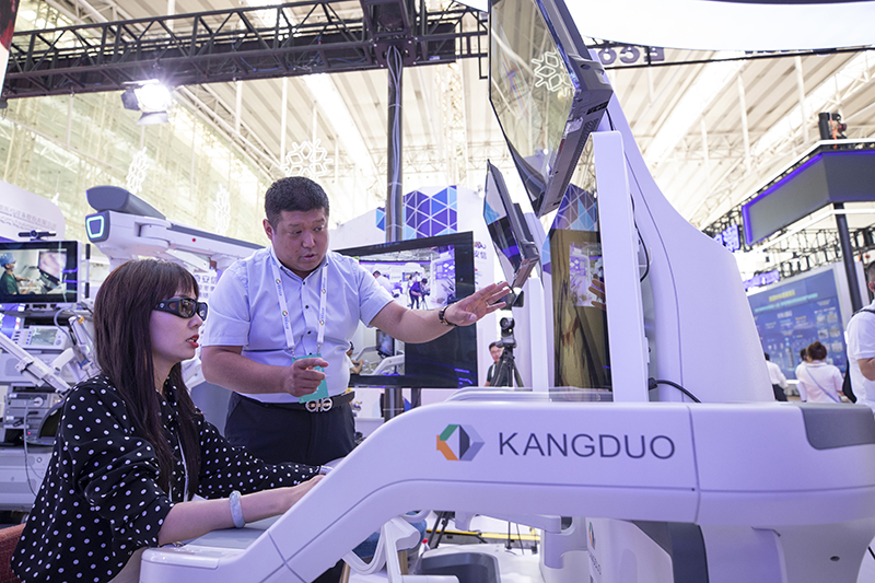 在黑龍江省哈爾濱市舉辦的2022世界5G大會(huì)展廳里,參展商現(xiàn)場(chǎng)演示5G遠(yuǎn)程手術(shù)機(jī)器人(2022年8月10日攝)。新華社記者 張濤 攝