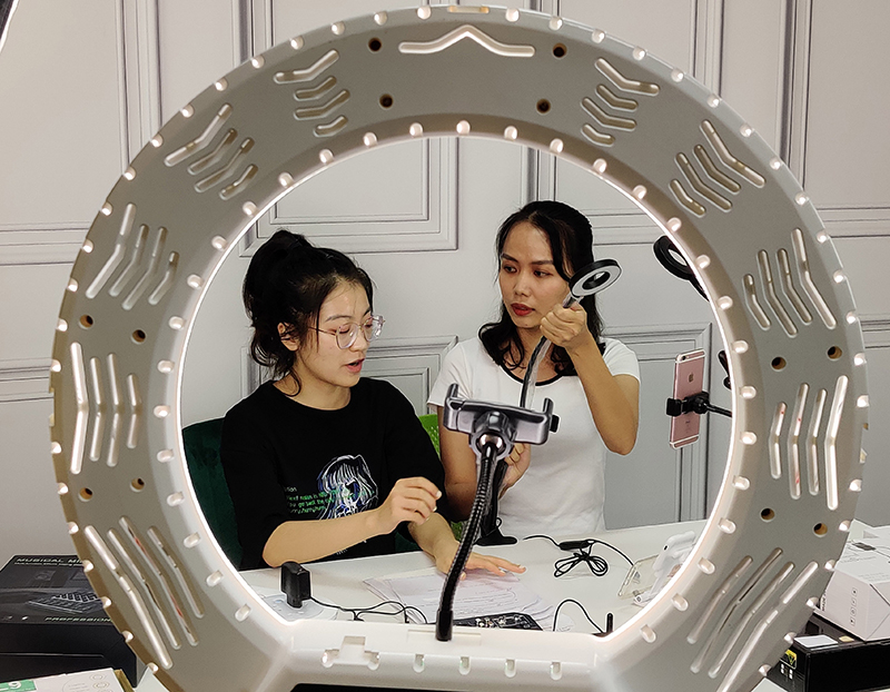 廣西外國語學(xué)院越南留學(xué)生鄧氏仙(右)在廣西自貿(mào)試驗(yàn)區(qū)南寧片區(qū)一家跨境電商企業(yè)直播人才孵化基地內(nèi)進(jìn)行直播(2020年8月25日攝)。新華社記者 雷嘉興 攝
