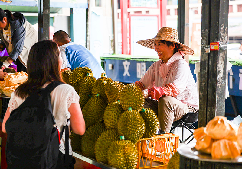 在廣西東興,越南果商在售賣榴蓮(2023年5月18日攝)。新華社記者 胡星宇 攝