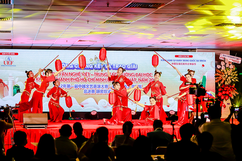 2022年4月15日,在越南胡志明市,胡志明市國家大學(xué)下屬人文社會科學(xué)大學(xué)學(xué)生表演舞蹈節(jié)目《團(tuán)圓之夜》。新華社發(fā)(中國駐胡志明市總領(lǐng)館供圖)