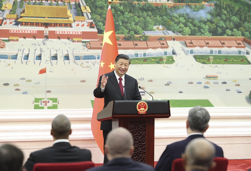 遞交國書儀式結束后,習近平在北京廳對使節(jié)們發(fā)表集體講話。